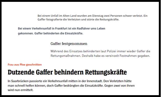 Zahlreiche Zeitungsartikel warnen vor den Folgen und zeigen auf, dass dadurch die Helfer gestört werden und die Privatsphäre der Unfallbeteiligten, Helfern und Rettungskräften verletzt werden.